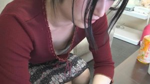 エンジ色のニットと真っ白おっぱい&ピンク乳首のコントラストが艶かしいJDバイト胸チラ盗撮