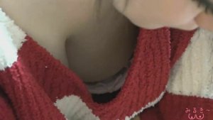 赤白ボーダーの巨乳人妻の胸チラ盗撮