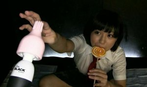 ペロペロキャンディーとえくぼが似合う小女子がブラシ付改造電マに興味珍々