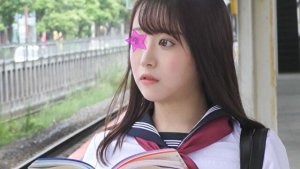 分厚い参考書で勉強に勤しむ優等生制服無毛肉厚マンコ電車痴漢